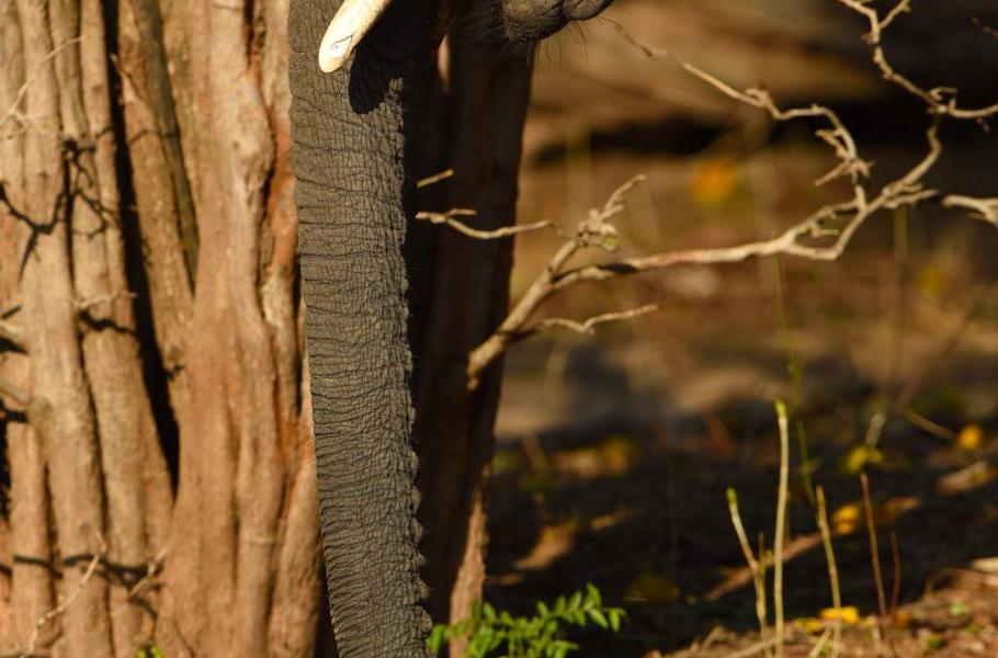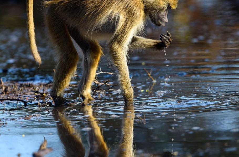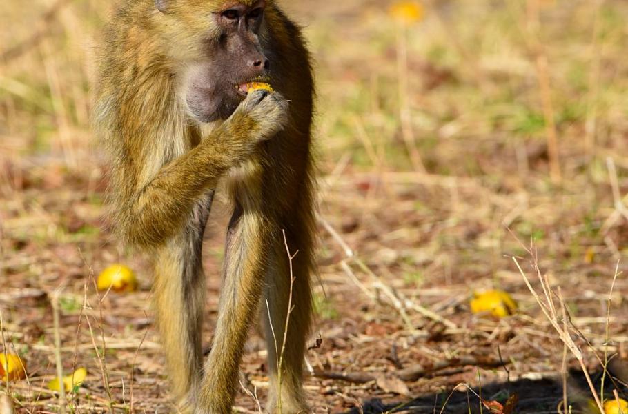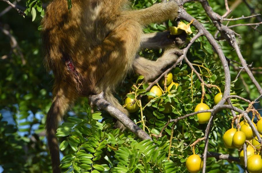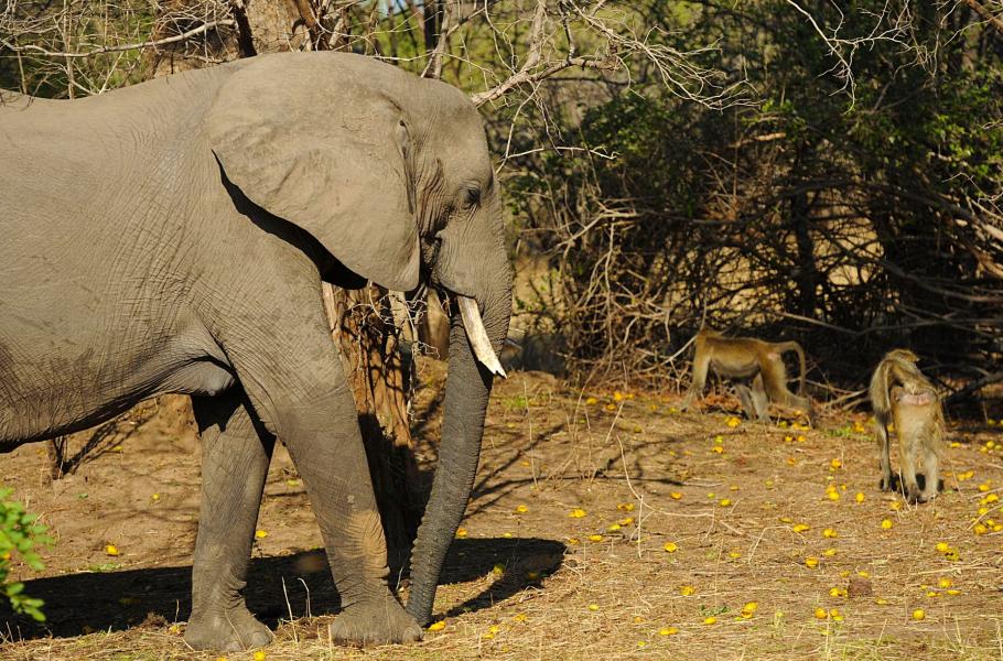 Dvanáct slonů se potulovalo pod vzrostlým stromem maruly (Sclerocarya birrea), v jehož koruně poskakovala dobře dvacítka paviánů a hlasitými skřeky se hašteřila a předháněla, kdo z nich si utrhne nejsladší plod. Na zelených větvích seděli jednotliví paviáni a mistrně trhali žluté ovoce. Někdy je hned rozpůlili a začali vykusovat sladkou dužinu. V mnoha případech, kdy nejzralejší plody vyrůstaly na konci nejtenčích větví a paviáni se museli držet všemi čtyřmi tlapami, jim ale nezbývalo než větví zatřepat, případně jednou rukou ovoce rychle utrhnout a shodit na zem. Poté ostrým zrakem zaměřili plod v trávě a rychle seběhli po kmeni dolů.