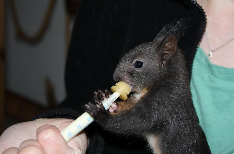 Jak jsme se dozvěděli od pana Petra, mladé veverky přecházejí na pevnou stravu (ořechy, pupeny, houby, semena šišek, žaludy, atd.) teprve kolem osmého týdne po narození. Do té doby se živí pouze mateřským mlékem, i když od šesti týdnů věku už na první pohled vypadají jako zmenšená kopie dospělé veverky. Ve skutečnosti však ještě nemají vyvinuty horní zuby, takže jsou po ztrátě matky bez mateřského mléka odsouzena k smrti hladem.