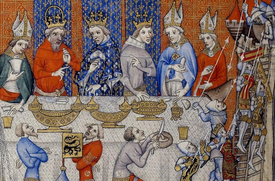 Banket na francouzském dvoře, kde roku 1378 francouzský král Karel V. (uprostřed v modrém) hostil císaře Karla IV. (vlevo v červeném) a jeho syna Václava IV. (vpravo).