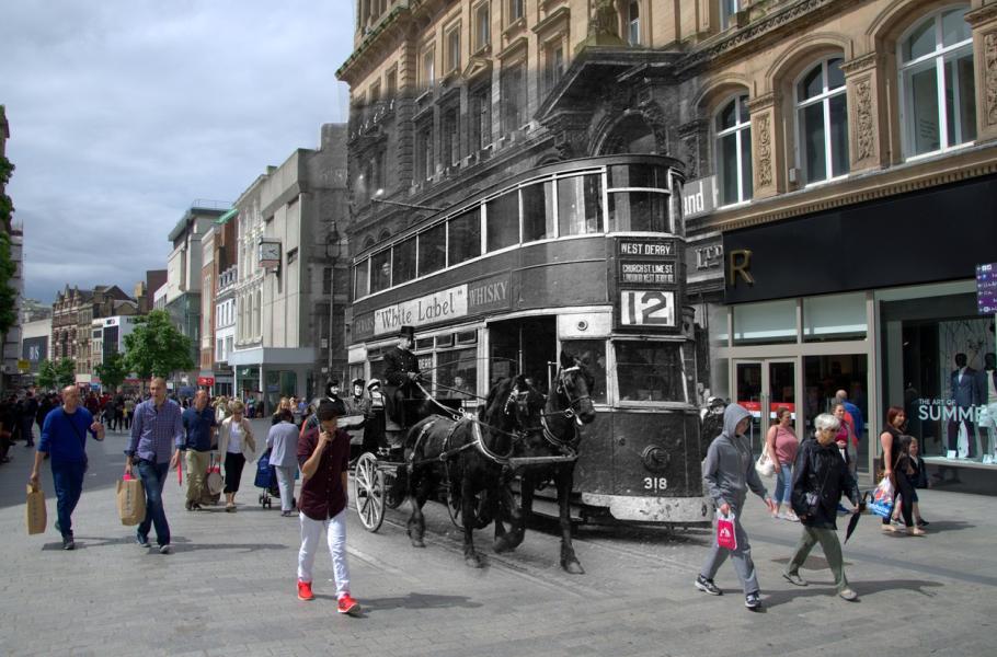 Liverpool kolem roku 1950 a dnes: Tramvaj na nedatovaném snímku v centru Liverpoolu.