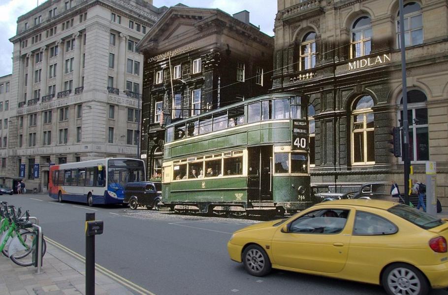 Liverpool v roce 1953 a dnes: Tramvaj, přezdívaná „zelená bohyně“, na liverpoolském náměstí Derby Square.