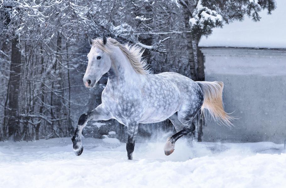 Šedá je nejtypičtější barvou orlovských klusáků. Na sněhu sice vypadají krásně, ale mají rádi spíše teplejší podnebí.