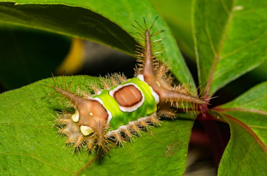 Housenka druhu Acharia stimulea se velmi účinně brání před predátory. Napomáhá tomu jed i ostnité výrůstky. Krmí mnoha různými rostlinami. Na Floridě a v Alabamě například pojídá listy ozdobných palem, jako je třeba tzv. „manilská palma“ (Adonidia merrillii). (foto: Shutterstock)