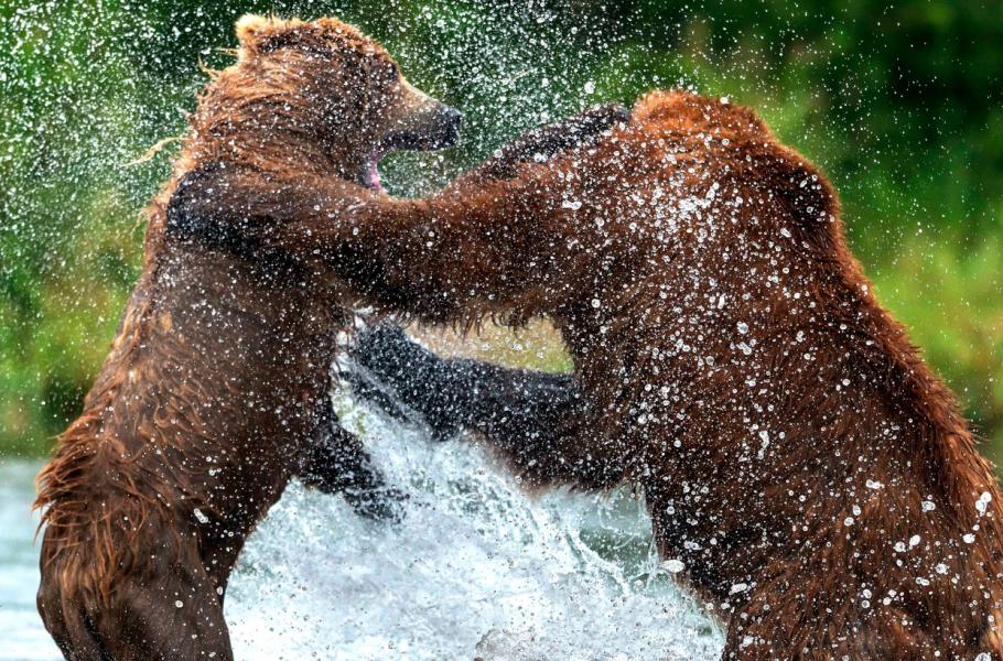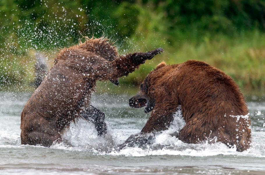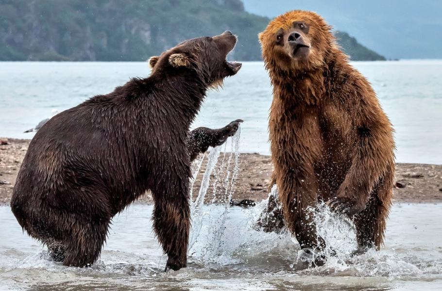 Jedinečná podívaná se naskytla italskému fotografovi Giuseppe D'Amico – na pobřeží Kurilského jezera zachytil lítý souboj dvojice medvědů kamčatských