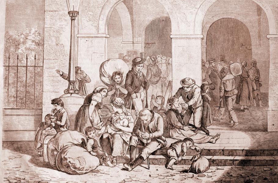 Skupina emigrantů směřujících za oceán čeká na pražském nádraží na vlak do německých přístavů (ilustrace z roku 1867). (foto: Wikimedia Commons, CC0)