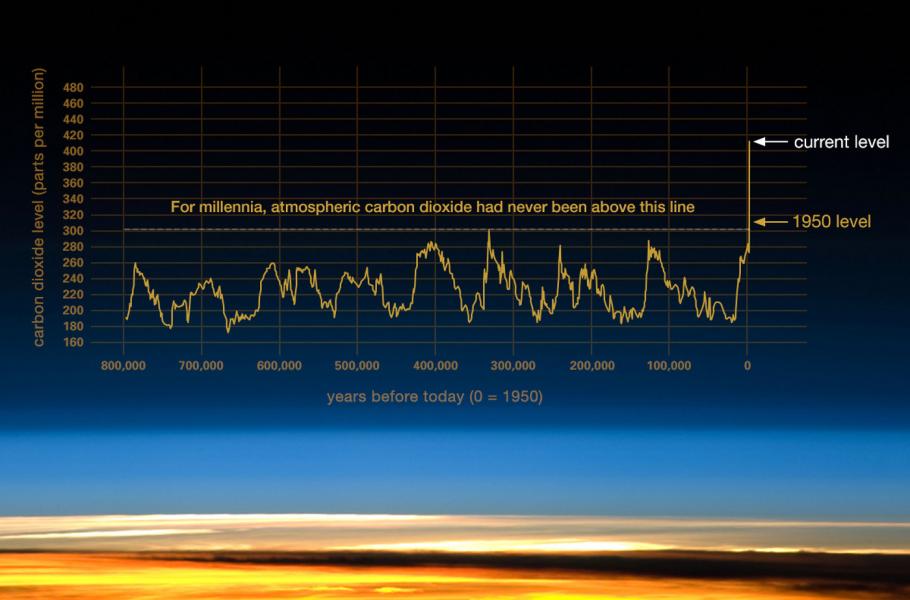 Hladina oxidu uhličitého (CO2) v atmosféře je vyšší než kdykoli v posledních 400 000 letech. Během doby ledové se hladina CO2 pohybovala kolem 200 ppm, během teplejších interglaciálních období to bylo okolo 280 ppm. V roce 2013 překročila hladina CO2 poprvé v zaznamenané historii 400 ppm.