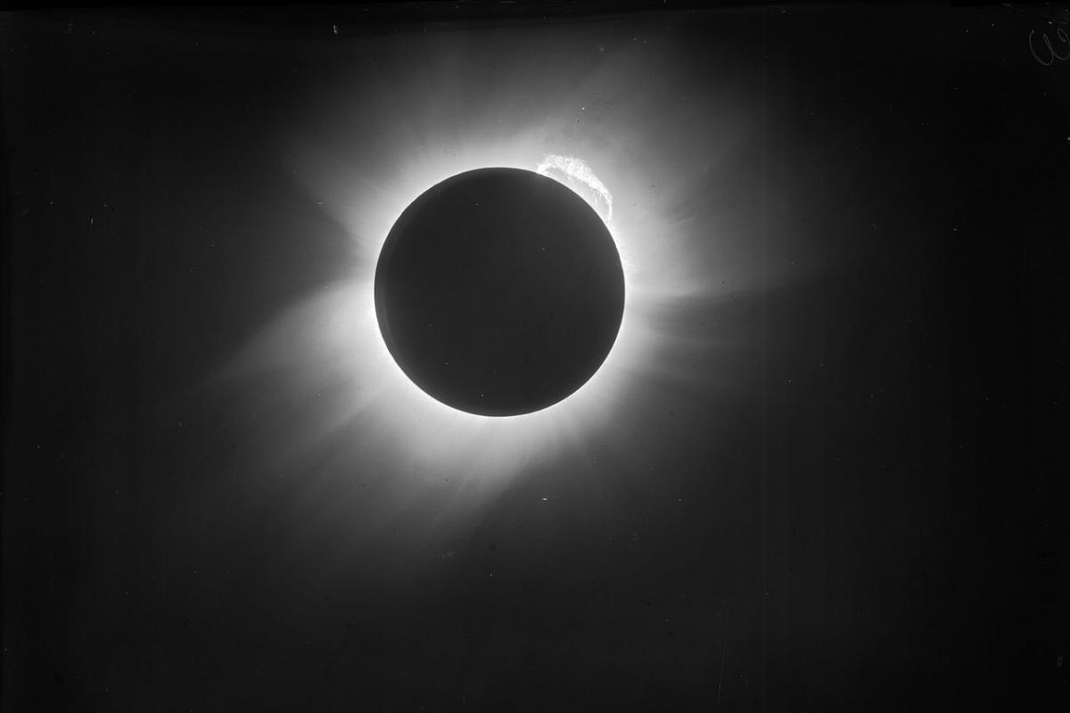 Záznam legendárního slunečního zatmění k nám promlouvá i po více než sto letech. Temný měsíční disk na něm zakrývá oslnivý sluneční kotouč, takže se ukazuje slabá strukturovaná koróna – plazmatická obálka hvězdy tvarovaná magnetickým polem, které tehdy bylo poměrně „divoké“. Úkaz se totiž odehrál zhruba dva roky po maximu patnáctého slunečního cyklu, a záběr tak zachycuje četné magnetické smyčky; dále lze rozeznat i dlouhé rovníkové koronální paprsky či magnetické póly vlevo nahoře, respektive vpravo dole.