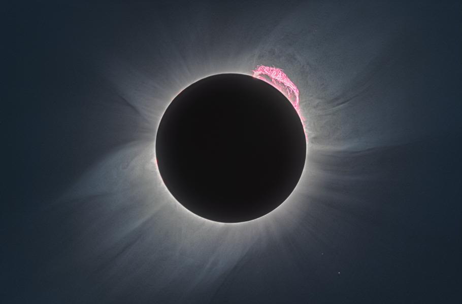 Nejúchvatnější je však narůžovělá protuberance – oblak chladnějšího plazmatu vznášející se nad povrchem stálice. Takto obří protuberance představuje během slunečního zatmění velmi vzácný jev a pravděpodobně jde o tu největší, jakou se kdy během zatmění naší hvězdy podařilo vyfotografovat.