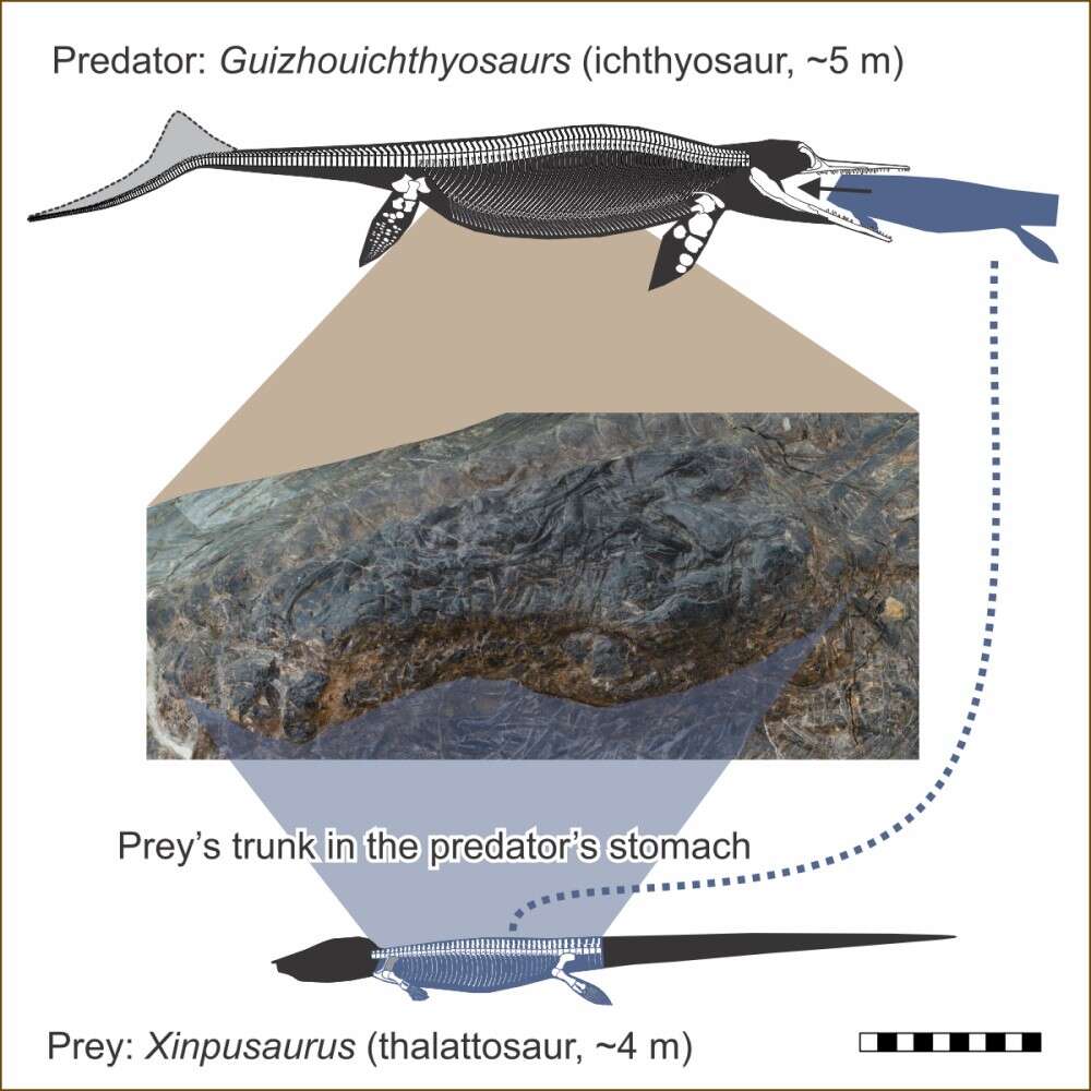 Během vykopávek v severozápadní Číně, objevili paleontologové zkamenělinu pětimetrového ichtyosaura rodu Guizhouichthyosaurus. Již sám o sobě pozoruhodný objev ale skrýval jedno další velké překvapení. Uvnitř ichtyosauřího těla totiž vědci objevili zkamenělinu i jeho poslední večeře – podstatnou část čtyřmetrového mořského „plaza“ ze skupiny thalattosaurů Xinpusaurus xingyiensis.