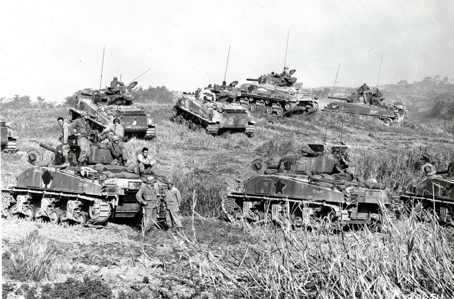 Přestože tanky Sherman nedosahovaly kvalit německých strojů, Američané jich narozdíl od nepřítele dokázali vyrobit mnohem víc. Na snímku příslušníci 713. tankového praporu během oddechu po tvrdých bojích na Okinawě. (foto: Wikimedia Commons, U.S. National Archives, CC0)