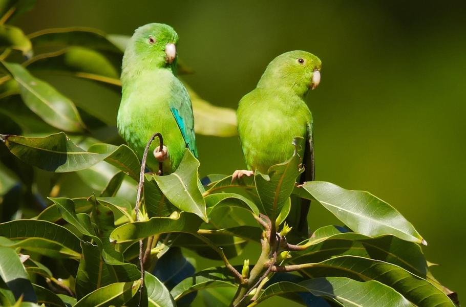 Každý papoušíček vrabčí (Forpus passerinus) má v rámci své rodiny jedinečné jméno. Na snímku dvojice poddruhu papoušíček vrabčí zelený (Forpus passerinus viridissimus) focená na ostrově Tobago.