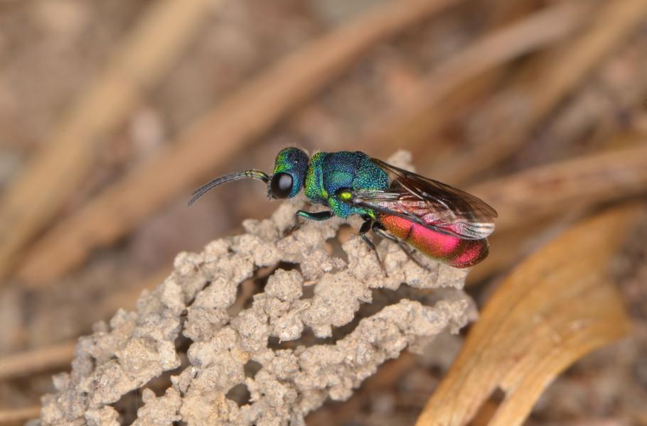 Jmenované útvary byly vyústěním chodbiček samotářských vos. Jenže do hnízd létalo nějak „moc“ vos. Byly tu minimálně dva druhy tohoto blanokřídlého hmyzu: samotářské vosy a krásné, drahokam připomínající vosičky zlatěnky ohnivé (Chrysis ignita), které na vosách samotářkách parazitují. Tenhle nádherný hmyz už jsem párkrát fotil, a proto jsem zlatěnky hned poznal. Nikdy se mi ale nepoštěstilo vidět je takhle intenzivně a zblízka.