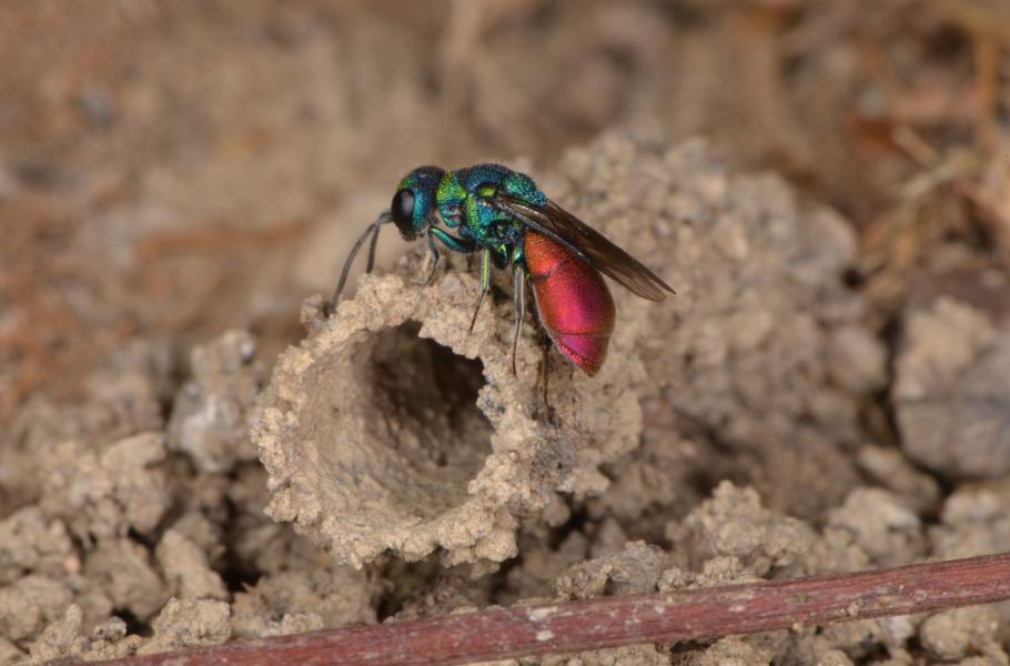 Zlatěnka ohnivá v celé kráse u vletového otvoru do hnízda svého hostitele – samotářské vosy. Kontroluje přítomnost hostitele a za okamžik zmizí v hnízdě