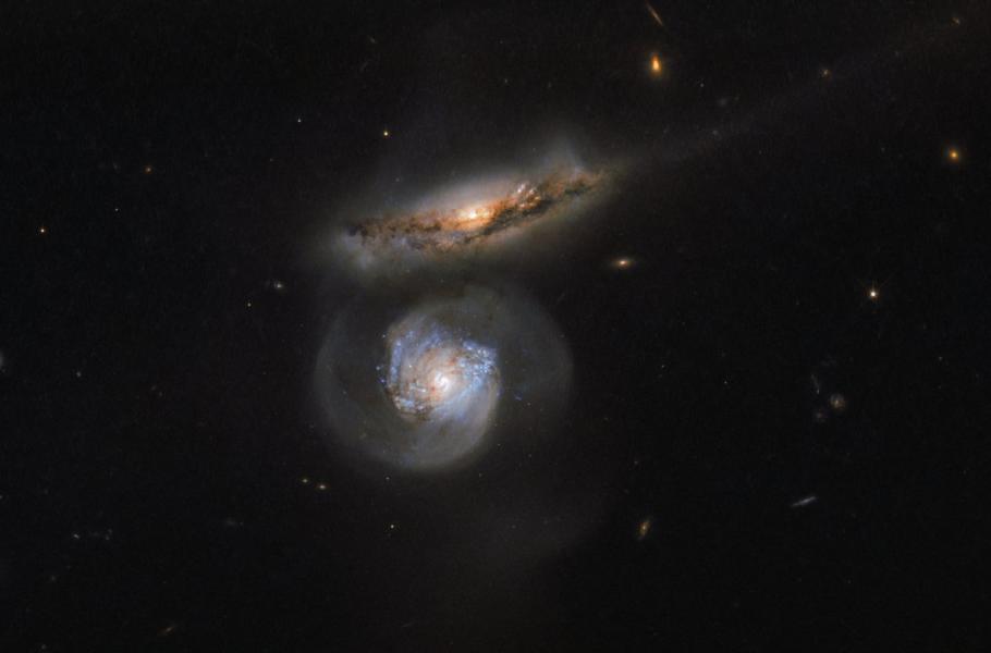 Na novém snímku Hubbleova vesmírného dalekohledu je vidět velmi estetická dvojice splývajících galaxií. Dohromady tvoří objekt NGC 5765 (A+B), který je od nás vzdálený asi 400 milionů let, a pozorujeme ho v souhvězdí Panny.