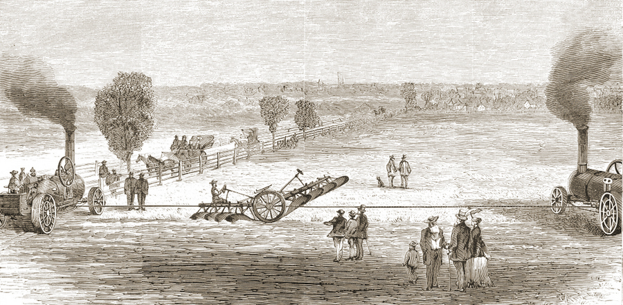 Orba pomocí dvou lokomobil ve Spojených státech amerických ve druhé polovině 19. století. Uvést parní lanovou orbu znovu do chodu by dnes obnášelo investici přibližně 14 milionů korun. (ilustrace: Wikimedia Commons, CC BY-SA 4.0)