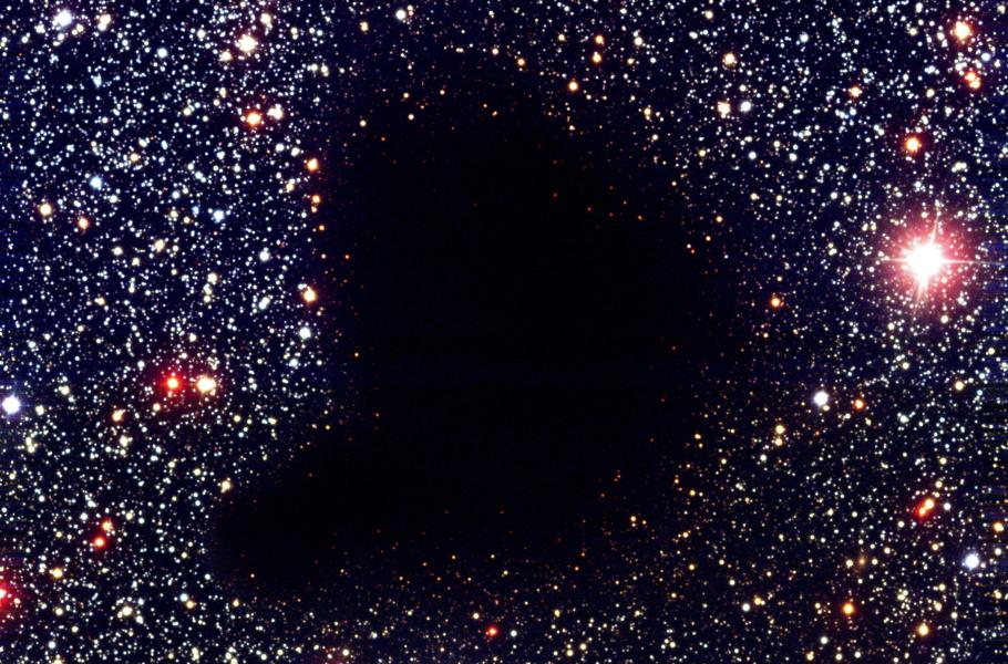 To, co jejich předchůdci kdysi považovali za díru v obloze, znají dnešní astronomové jako molekulární mrak: Vysoká koncentrace plynu a prachu absorbuje prakticky veškeré viditelné světlo vydávané hvězdami v pozadí. Temné okolí činí vnitřek molekulárních mračen jedním z nejchladnějších a nejizolovanějších míst ve vesmíru. K nejpozoruhodnějším tmavým absorpčním mlhovinám patří mračno v souhvězdí Hadonoše, nesoucí označení Barnard 68. Od Země jej dělí asi jen 500 světelných let a měří 1,5 světelného roku. Odborníci dosud přesně nevědí, jak podobná molekulární mračna vznikají, zřejmě se v nich však rodí nové hvězdy. A také mlhovina Barnard 68 nejspíš kolabuje za vzniku hvězdného systému. Mračno si můžeme prohlédnout prostřednictvím infračerveného světla.