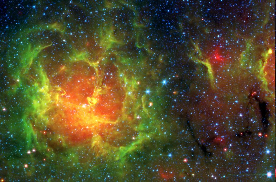 Mlhovinu Trifid, známou také jako M20, najdete snadno i malým dalekohledem. Měří asi 30 světelných let, dělí ji od nás 5 500 světelných roků a představuje oblíbený cíl kosmických turistů v souhvězdí Střelce. Jak naznačuje její jméno, ve viditelném světle ji rozdělují na tři části tmavé neprůhledné pásy prachu. Ovšem pronikavý infračervený snímek, pořízený Spitzerovým teleskopem, odhaluje filamenty zářících prachových mračen a nově vzniklých hvězd. Astronomové fotografii použili ke sčítání čerstvě zrozených a embryonických stálic, jež se jinak skrývají v oblacích zárodečného prachu a plynu této fascinující hvězdné porodnice. Spitzerův dalekohled byl vypuštěn v roce 2003, aby zkoumal infračervený vesmír. 30. ledna 2020 svou vědeckou činnost ukončil.