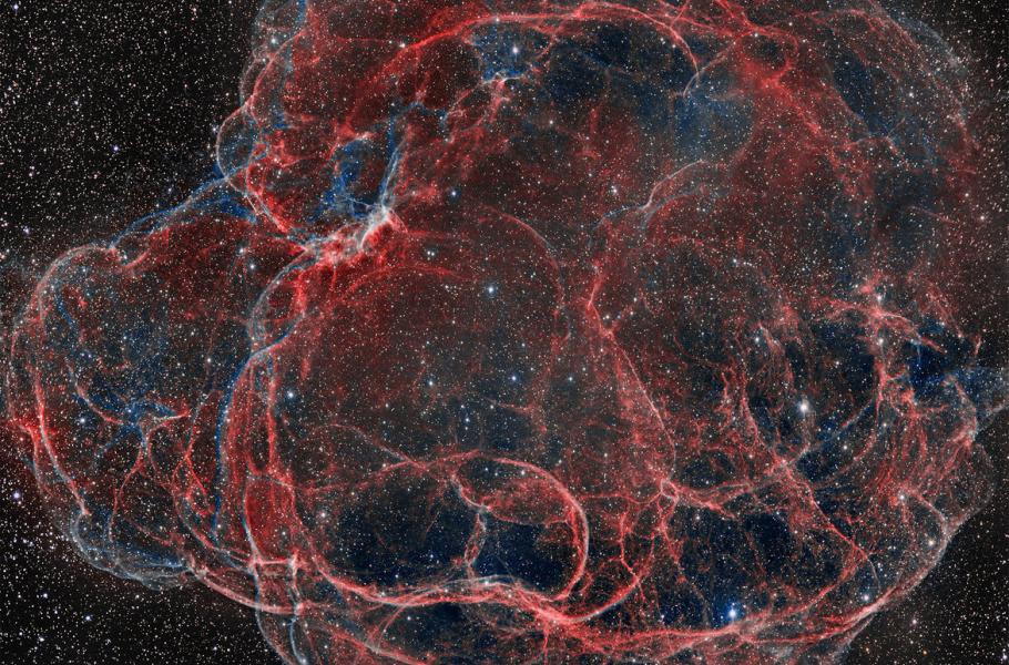 Zbytek supernovy Simeis 147 proslul díky množství spletitých filamentů jako Špagetová mlhovina. Promítá se na pomezí souhvězdí Býka a Vozky, kde pokrývá téměř 3° neboli šest úplňků – což při odhadované vzdálenosti tří tisíc světelných let odpovídá rozměru 150 světelných roků. Kompozitní snímek obsahuje obrazová data získaná přes úzkopásmové filtry pro červenou emisi ionizovaných atomů vodíku a slabě modrozelenou emisi dvakrát ionizovaného kyslíku, jež sledují zářící plyn stlačený rázem. Stáří zbytku supernovy odhadují astronomové na 40 tisíc let. Kromě rozpínajících se obálek po sobě kosmická katastrofa zanechala také pulzar, tedy rotující neutronovou hvězdu.