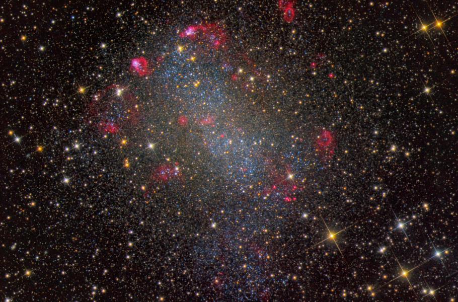 Také v menších galaxiích, jako je blízká NGC 6822, vznikají hvězdy. Barnardova galaxie se na obloze promítá do souhvězdí Střelce, od Země ji dělí asi 1,5 milionu světelných let a patří do naší Místní kupy. Jedná se o nepravidelný trpasličí hvězdný ostrov s rozměrem okolo sedmi tisíc světelných roků, podobný Malému Magellanovu mračnu. Na hloubkovém barevném kompozitním snímku jej zaplňují mladé modré stálice a ozvláštňují ho růžové hvězdotvorné oblasti zářícího vodíku.