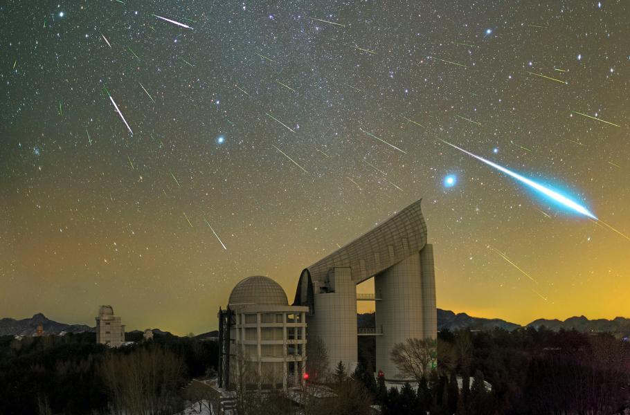 Jak dokládá snímek oblohy nad čínskou observatoří Sing-lung, „padající hvězdy“ meteorického roje Geminid zdánlivě vycházejí ze souhvězdí Blíženců neboli Gemini. Mateřské těleso, jehož kousky hornin o velikosti zrnek písku prolétají naší atmosférou, představuje zřejmě planetka 3200 Phaethon. Geminidy patří mezi nejlépe předvídatelné i nejaktivnější roje a odehrávají se každoročně v prosinci.