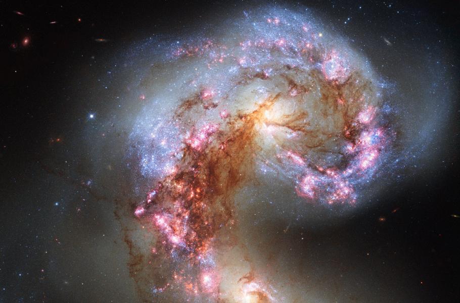 V jižním souhvězdí Havrana se ve vzdálenosti 60 milionů světelných let srážejí dvě velké galaxie. Kosmickou kolizi zachytil v úžasných podrobnostech Hubbleův dalekohled, její dohra však potrvá stamiliony roků. Jednotlivé stálice z hvězdných ostrovů NGC 4038 a NGC 4039 se nesrážejí – na rozdíl od velkých mračen plynu a prachu, jež tak vyvolávají epizody zuřivého vzniku hvězd poblíž centra událostí. Daleko od scény kolize se nacházejí pomíchané nové hvězdokupy a mezihvězdná hmota, vymrštěné gravitačními silami. Detailní snímek zabírá asi 50 tisíc světelných let a dvojice hvězdných ostrovů má na širokoúhlém pohledu sugestivní podobu s daleko sahajícími obloukovitými strukturami, které páru propůjčily populární název Tykadlové galaxie.