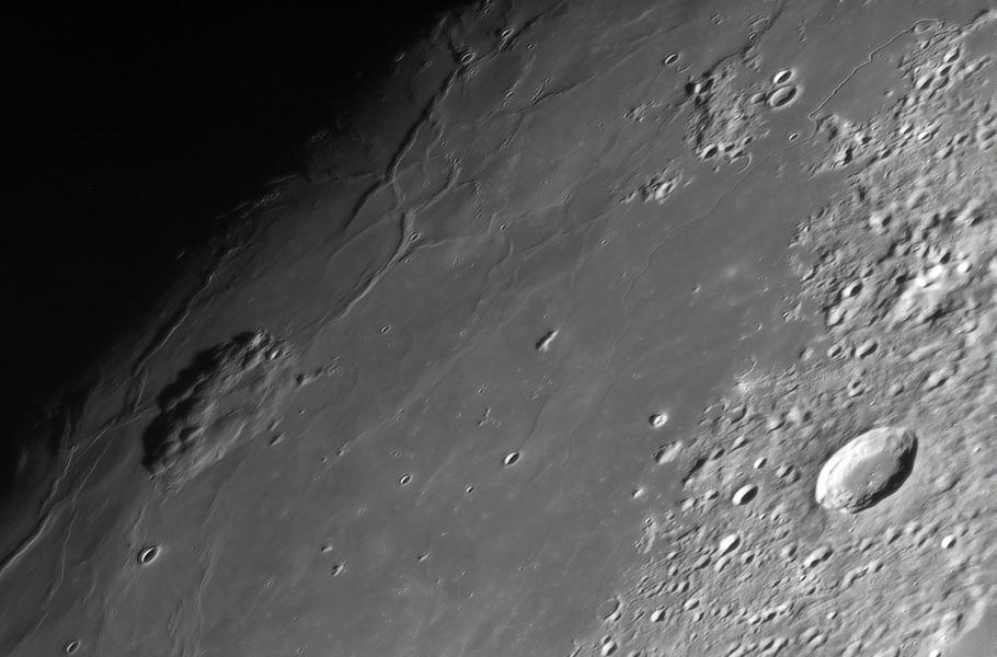 Nad Oceánem bouří, rozlehlým hladkým lunárním mořem, se do výšky 1 100 m vypíná komplex sopečných dómů Mons Rümker: Útvar o šířce 70 km se na snímku z předloňského 27. listopadu právě nachází na rozhraní mezi dnem a nocí, tedy v oblasti terminátoru. Teleskopický pohled zachytil i místo přistání čínské sondy Čchang-e 5, jež 1. prosince 2020 dosedla v lokalitě napravo od středu fotografie a severně od Mons Rümker.