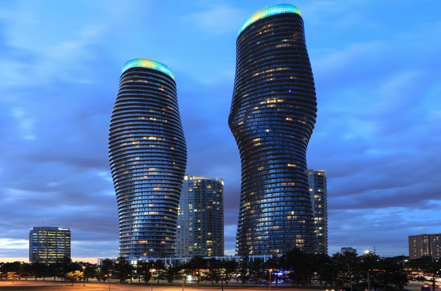 Dvě bytové věže kanadského mrakodrapu Absolute World patří ke komplexu Absolute City Centre, který čítá celkem pět výškových budov. Vyšší z dvojice má 209 poschodí a obě věže pak vynikají neotřelým designem: Podlaží rotují a každé je vždy o několik stupňů otočené vůči předchozím. (foto: Shutterstock)