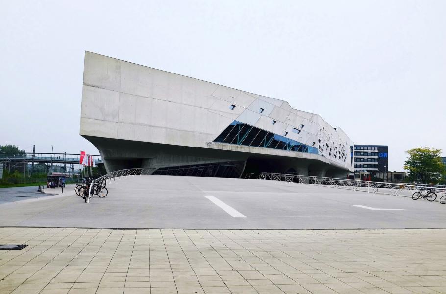 Interaktivní přírodovědecké centrum Phæno v německém Wolfsburgu navrhla slavná architektka Zaha Hadidová tak, aby se rozsáhlá stavba zdánlivě vznášela. První patro spočívá na masivních zúžených sloupech, a přímo pod budovou se tak mohou konat nejrůznější akce. Centrum se nachází v místě mezi železnicí, průmyslovou zónou a městem a pro veřejnost se otevřelo roku 2005. (foto: Wikimedia Commons, Spyrosdrakopoulos, CC BY-SA 4.0)