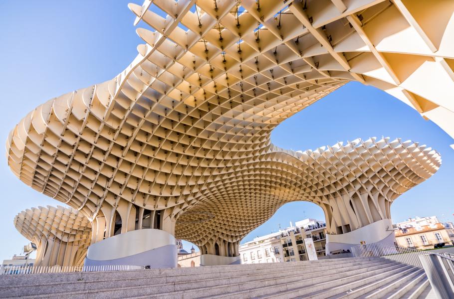 Ikona španělské Sevilly, Metropol Parasol z dílny německého architekta Jürgena Mayera připomíná obrovské houby a tvoří ji tři tisíce dřevěných prvků o různé výšce i délce. V jejích útrobách se nachází tržnice, restaurace či pódium, do suterénu se pak lze vydat na prohlídku archeologického muzea, zatímco ze stezek na vrcholu se otevírá výhled na pulzující metropoli Andalusie. (foto: Shutterstock)