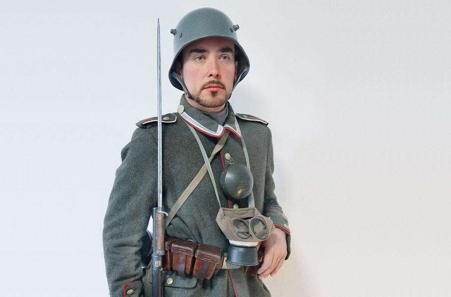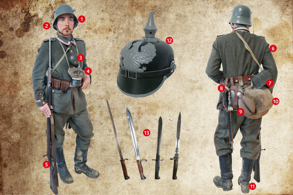 Kromě špičkové taktiky mohli Němci spoléhat také na vynikající výstroj a výzbroj. Poddůstojník na následující dvoustraně je oblečen do uniformy zvané Feldrock 1913, původně určené pro Landwehr a Landsturm (záložní zeměbrana a domobrana). Jedná se o zjednodušené provedení pěchotního Feldrocku 1907, který postrádal stahovací pas a byl celkově volněji střižen. Stále se však jednalo o tradiční stejnokroj vycházející z barevných uniforem 19. stol. V září 1914 pak kvůli zjednodušení výroby zavedli „třináctku“ také pro řadovou i gardovou pěchotu. Přestože se jedná o blůzu z předválečných časů, vyobrazená uniforma má „válečnou“ modifikaci v podobě nabarvení lesklých mosazných knoflíků zelenou „kamuflážní“ barvou – v souladu s předpisem z roku 1915.