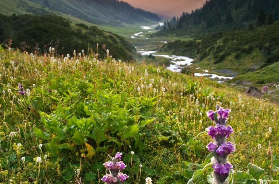 Za orlí jurtou je už cesta o něco horší, a na rozdvojce údolí Djety-Oguz a Teleti se z ní stává regulérní stezka. Po pár hodinách konečně vycházíme z lesa a kocháme se pohledy, o jakých jsme snili. Pod zaledněnými horami (nejvyšší bod pohoří, Pik Jelcina, má 5 216 m n. m.) se na svěží zelené trávě, protkané desítkami pestrobarevně kvetoucích rostlin a průzračně čistým potokem, prohánějí stáda koní. Na jednom z méně podmáčených míst si stavíme kemp, pro mě jeden z nejhezčích v životě. I díky jasné obloze se soumrak na tomto místě proměňuje ve fotografické orgie.