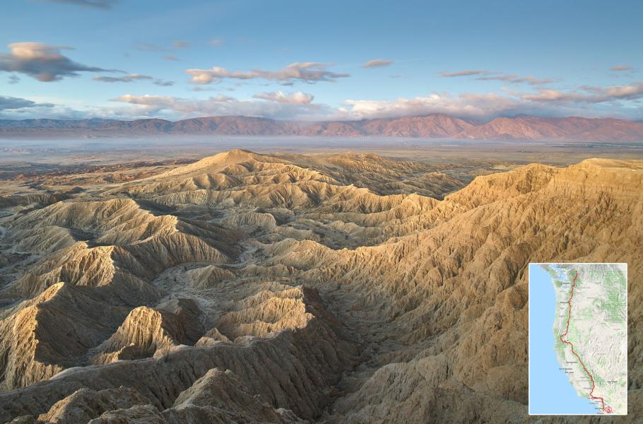 Devět z deseti nadšenců začíná svou pouť právě tady, obvykle na přelomu dubna a května. Poušť totiž ještě nesnesitelně nežhne, ale sníh v pohořích na trase už odtává. V době, kdy cestovatelé dosáhnou jejich vrcholků, hrozí mnohem nižší riziko lavin a náhlých záplav. S rozlohou 2 371 km² představuje Anza-Borrego největší národní park Kalifornie. Návštěvníci jej mohou objevovat prostřednictvím 800 km polních cest a 180 km turistických stezek. Natrefí přitom na širokou plejádu kaktusů, pouštních květin, ale i na ohrožené ovce Nelsonovy.