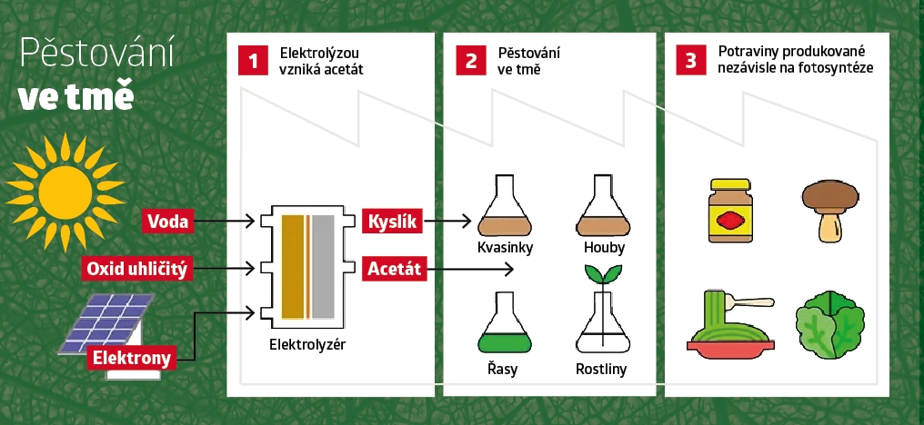 Základem řešení se staly solární panely: Vědci však nehodlali získanou energii využít k rozsvícení výkonných lamp, jež by svit slunce simulovaly, nýbrž k přímé produkci životodárných látek. Směs oxidu uhličitého a vody se pomocí elektrolýzy rozložila na prvky, z nichž byl poté získán acetát nebo také octan – základní složka octů. A ta rostlinám poskytne veškerou výživu, kterou by si za normálních podmínek opatřovaly fotosyntézou.