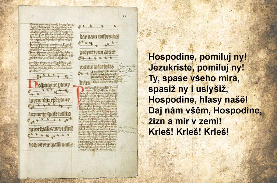 Není divu. V dobách středověku se hudba pěstovala zejména k liturgickým účelům, jejichž výsostním jazykem byla latina. Vedle církevních litanií však souběžně vznikaly písně zpívané obyčejnými lidmi, kterým duchovní jazyk nic moc neříkal. Pokud se však nestaly všeobecně známým (s odpuštěním) hitem, měly jen pramalou naději na zachování do budoucna. Písni Hospodine, pomiluj ny se ale zacílení na publikum natolik povedlo, že se na dlouhý čas stala jakousi pomyslnou hymnou tehdejší společnosti. (foto: Wikimedia Commons, CC0)
