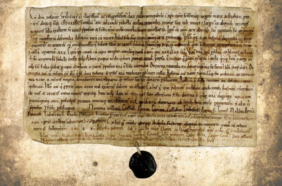 V překladu zápis hovořil o darování pozemku i se dvěma nevolníky: „Pavel dal jest Ploskovicích zem´u, Vlach dal jest Dolás zem´u bogu i svatému Ščepánu se dvěma dušníkoma, Bogučeja a Sedlatu.“ Neboli Pavel dal v Ploskovicích pozemek a Vlach dal v Dolanech pozemek Bohu a svatému Štěpánu (tedy daroval jej svatoštěpánskému kostelu) se dvěma nevolníky Bogučejem a Sedlatou. (foto: Wikimedia Commons, CC0)