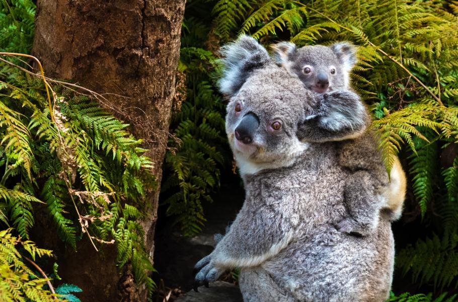 Koalí mláďata váží po narození pouze 0,5 gramu a po příchodu na svět vlezou matce do vaku, kde se přisají. Po třinácti týdnech kojení dosahují stonásobku porodní hmotnosti, pomalu také začínají otevírat oči a roste jim srst. Za šestadvacet týdnů již připomínají malého dospělce. (foto: Profimedia)