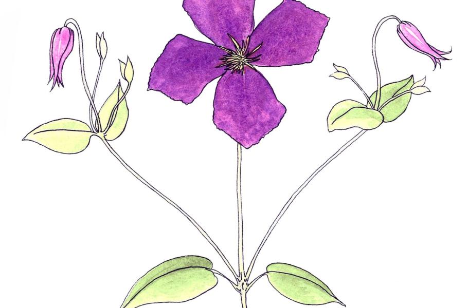 Má lichozpeřené listy složené z 5–7 lístků. Květy vyrůstají obvykle jednotlivě na vrcholech větví i v úžlabí listů, jsou nejčastěji modré, fialové, vzácněji červené. Tento plamének má menší široce zvonkovité květy se čtyřmi okvětními lístky.