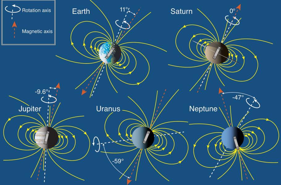 U každé planety je vyznačena osa magnetického dipólu vzhledem k rotační ose a také jeho posun, který je dobře patrný zejména v případě Uranu a Neptunu