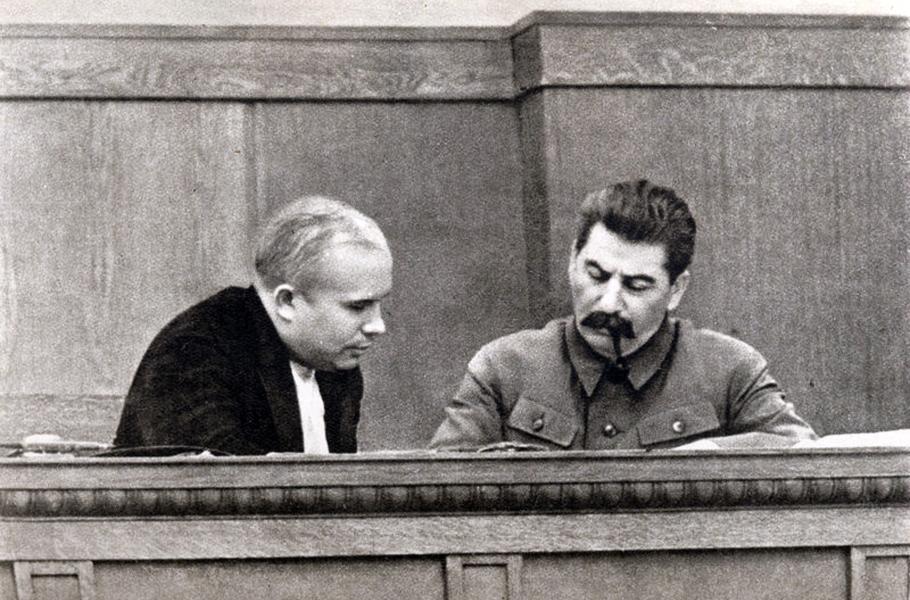 Mladý Chruščov vedle Stalina v roce 1936, dvacet let předtím, než vystoupil s kritikou Stalinova kultu osobnosti