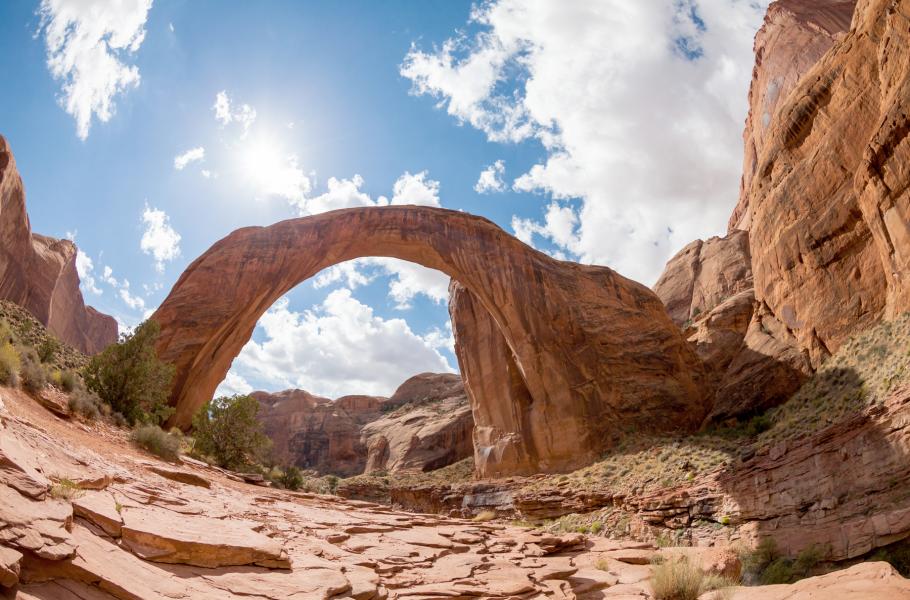Jeden z největších přírodních skalních oblouků na světě se nachází v národní chráněné oblasti Glen Canyon National Recreation Area v americkém Utahu. Dosahuje rozpětí 83 metry, tyčí se do výšky 33 metrů a na vrcholu měří 13 metrů na délku a 10 metrů na šířku. Vznikl zvětráváním pískovce po dobu 200 milionů let, kdy se okolní prostředí zásadně přetvářelo: Někdejší dno moře se proměnilo ve skálu ukrytou v mokřadech a džungli, zatímco v současnosti jde o dominantu vyprahlé pouštní krajiny. Duhový most tvořil důležité rituální místo pro Navahy a lokalita zůstává pro indiánský kmen posvátná i dnes. K oblouku tak sice vede stezka pro pěší, ale přímo pod most a do jeho těsné blízkosti je vstup přísně zakázán. (foto: Shutterstock)