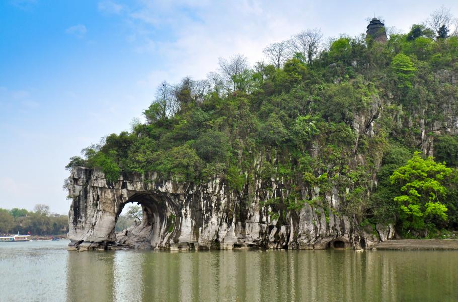 Skalního slona, který „pije“ z řeky Li-ťiang, spatříte v jihočínské autonomní oblasti Kuang-si. Vápencová Sloní hora patří mezi tamní nejvíc navštěvované atrakce a turisté k ní přijíždějí už od dob dynastie Tchang, jež vládla do 10. století. Oblouk chobotu nazývaný Vodní měsíční jeskyně lze obdivovat nejen ze vzdáleného břehu, nýbrž také z loďky, a při návštěvě za tmy se navíc na hladině odráží Měsíc. Po kamenných schodech můžete potom vystoupat na kopec nad řekou, k buddhistické pagodě vystavěné za dynastie Ming. (foto: Shutterstock)