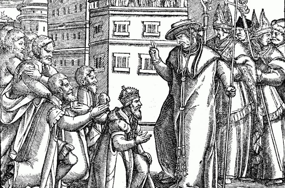 Příjezd legáta měl stejnou autoritu jako příjezd samotného papeže. Na dřevorytu líbá legátovi koleno anglický král Jiří II.