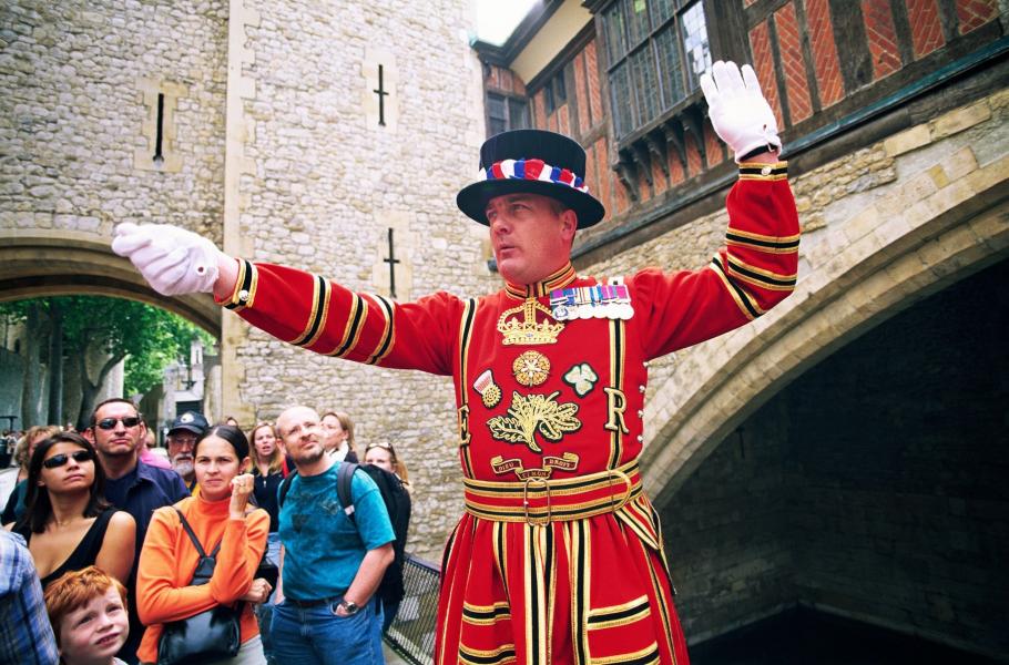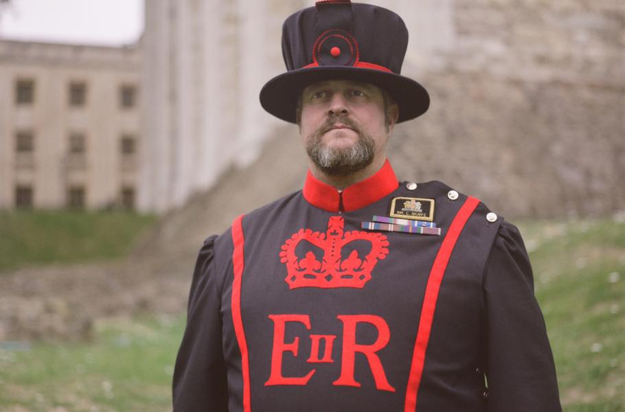 Setkal jsem se s ním v sobotu ráno, zatímco venku bylo zataženo a mrholilo. Měl na sobě svoji každodenní uniformu: plochý klobouk s krempou, tmavě modrou tuniku a insignie, jež vzdávají čest královně. Je to robustní chlap, bývalý střelec z kulometu, který po 24 letech služby v armádě získal post Yeoman Warder neboli „svobodný strážce“. Dnes už jde pouze o ceremoniální roli pro vysloužilé vojáky a populárně se jim neřekne jinak než „Beefeater“ (doslova „pojídači hovězího masa“ – za vlády Tudorovců dostávali narozdíl od ostatních v rámci služby každý den velké porce masa). Celkem 37 z nich si stále svou pozici drží – místo hlídání vězňů v Toweru však střeží především tradici a dělají průvodce.
