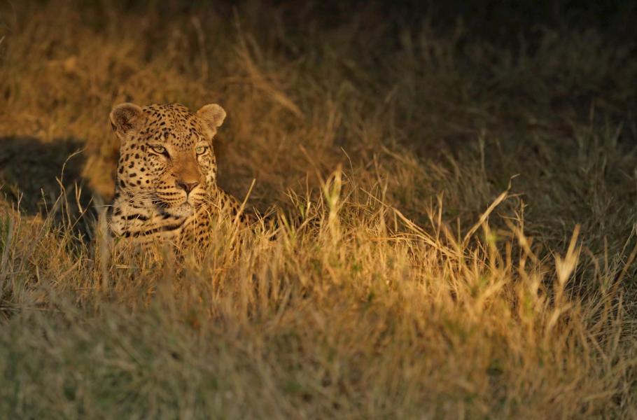 Samec ležel se vztyčenou hlavou asi jen dva metry ode mne v suché trávě. Choval se naprosto uvolněně a světlo baterky ani nepravidelné intenzivní výboje externího blesku ho nijak neznepokojovaly. Vypadal sice jako přerostlý plyšák, ale nutkání nafotit jej pěkně od země mi průvodce s úšklebkem okamžitě rozmluvil. Pohled do levhartích očí z bezprostřední blízkosti mi i tak zůstane dlouho vryt do paměti.