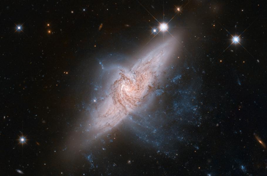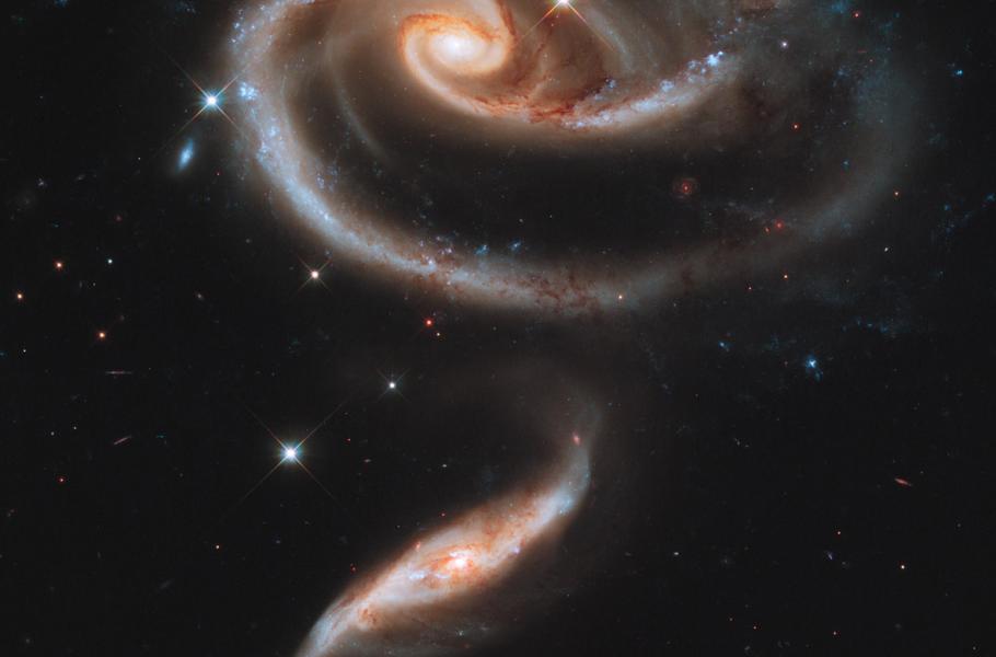 Při příležitosti 21. výročí startu Hubbleova dalekohledu vznikla fotografie velké spirální galaxie UGC 1810. Její disk deformují gravitační síly doprovázejícího hvězdného ostrova, v důsledku čehož oba objekty vytvořily uskupení podobné „kosmické růži“. Soustava známá též pod označením Arp 273 se nachází v souhvězdí Andromedy a od Země ji dělí zhruba 300 milionů světelných let. Větší člen dvojice je asi pětkrát hmotnější než menší průvodce, přičemž modré ostrůvky v jeho struktuře představují kombinaci intenzivního záření hvězdokup a horkých mladých modrých hvězd. Galaxii poprvé popsal americký astronom Halton Arp v roce 1966.