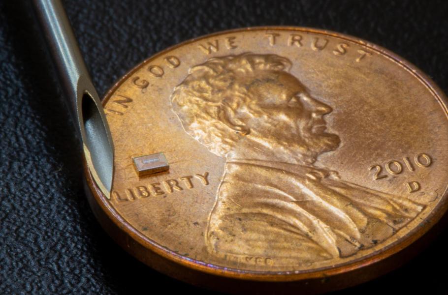 Velkou výhodou nového biosenzoru je jeho velikost a úspornost. Takhle vypadá v porovnání s injekční jehlou a mincí.