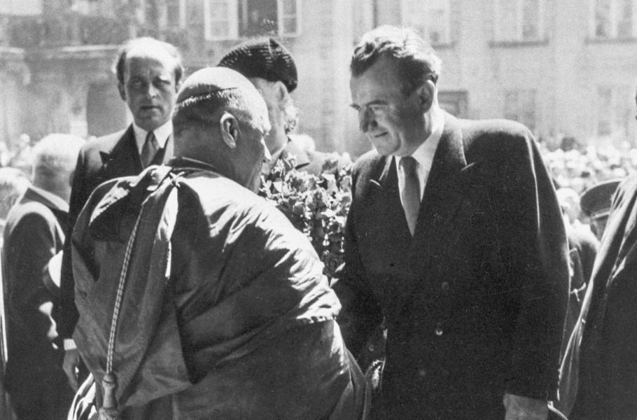 Arcibiskup Josef Beran při setkání s prezidentem Gottwaldem. Brzy se však ukázala spolupráce církve a nového režimu jako nemožná a Beran skončil v internaci. (foto: Profimedia/ČTK)