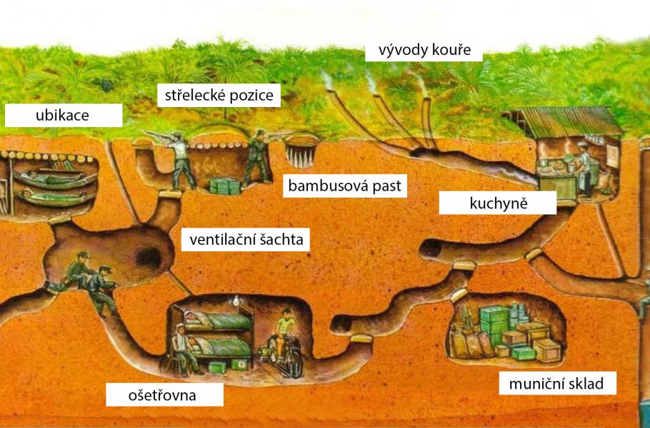 Dodnes se zachovalo 120 km z původních 200 km spletité podzemní sítě, kde během války číhalo na nezvané hosty nebezpečí na každém kroku. V černočerné tmě se skrývali nejen nepřátelští bojovníci a jejich nastražené léčky, ale i mravenci, jedovaté stonožky, pavouci a hadi. Zatímco venku zuřil válečný konflikt, v tunelovém propletenci pod povrchem se v provizorních podmínkách rodily děti, uzavíraly sňatky a občas i hrálo divadlo.