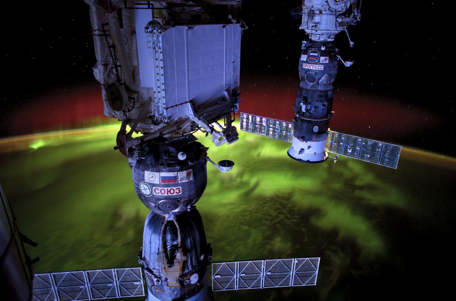 Polární záře pod dohledem ruských nákladních lodí Sojuz a Progress, které slouží k zásobování Mezinárodní vesmírné stanice. Aurora pozorovaná z oběžné dráhy představuje i pro kosmonauty velký zážitek.