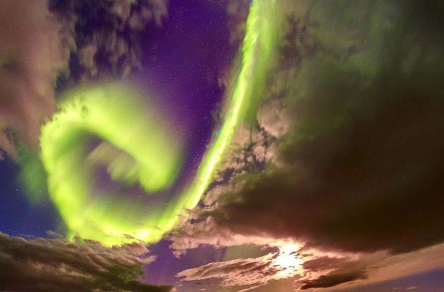 Island je pro pozorování polárních září zemí zaslíbenou. Tuto spirálu zachytil fotograf na pomezí dne a noci nad jezerem Thingvallavatn na jihozápadě ostrova. Voda vyplňuje zlom, v němž se do sebe zaklesávají dvě tektonické desky – Euroasijská a Severoamerická.
